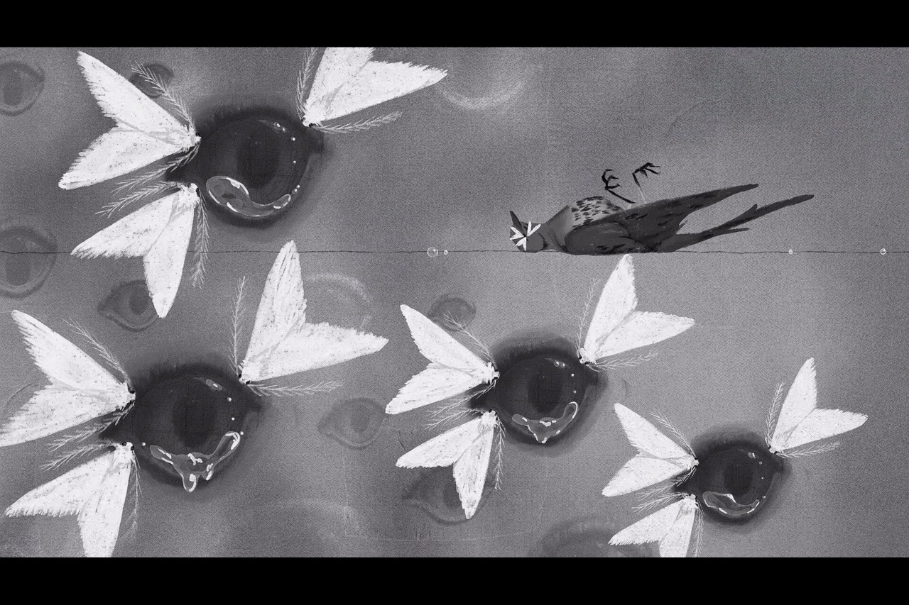 A poetic tale of a parasitic moth feeding on tears. While hunting wild animals to sustain itself, the moth risks becoming prey—delicate animation transforms each tear into a symbol of nature's fragile balance between predator and victim.